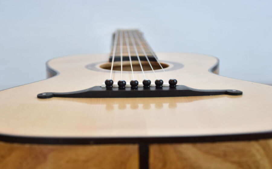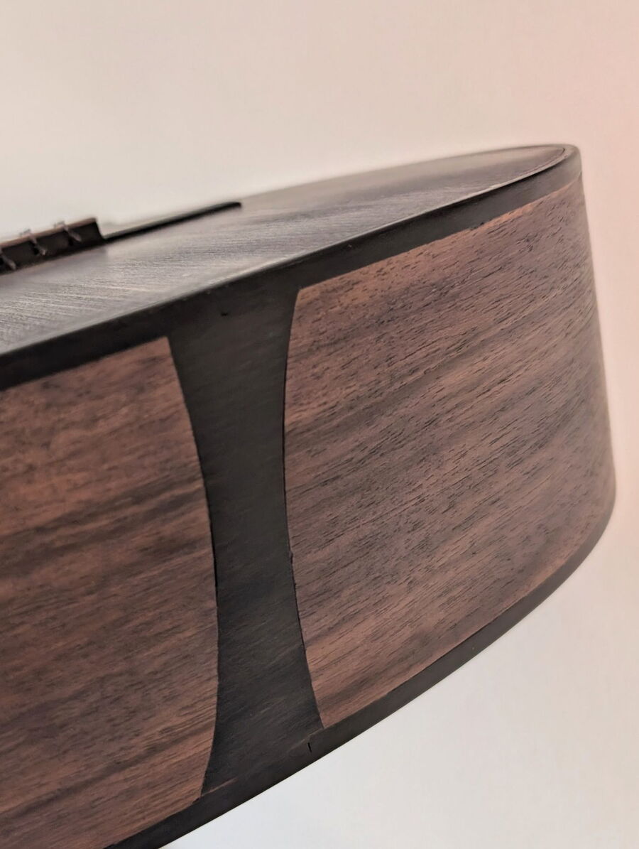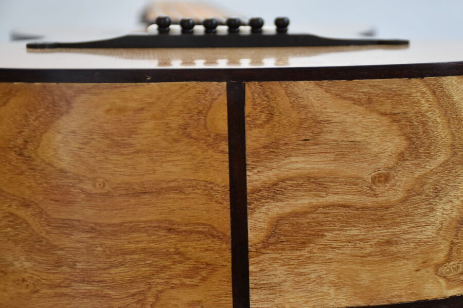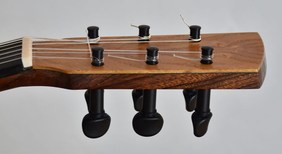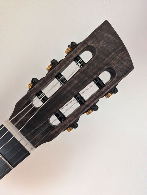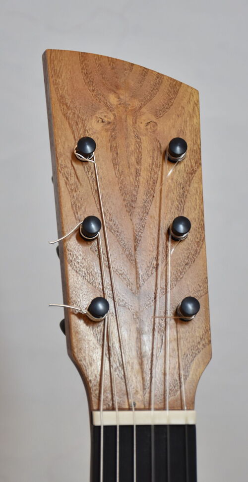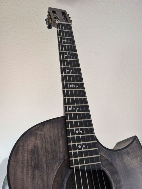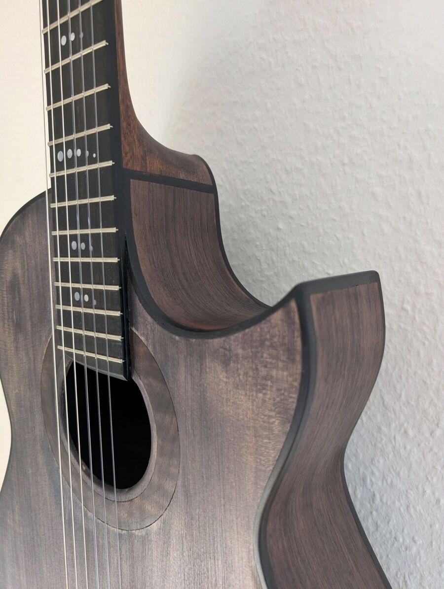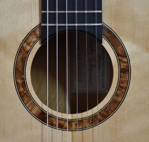 eine Besonderheit sind die selber hergestellten Mosaikstreifen an der Rosette, Bindings, Saitenhalter und Kopfplatte!